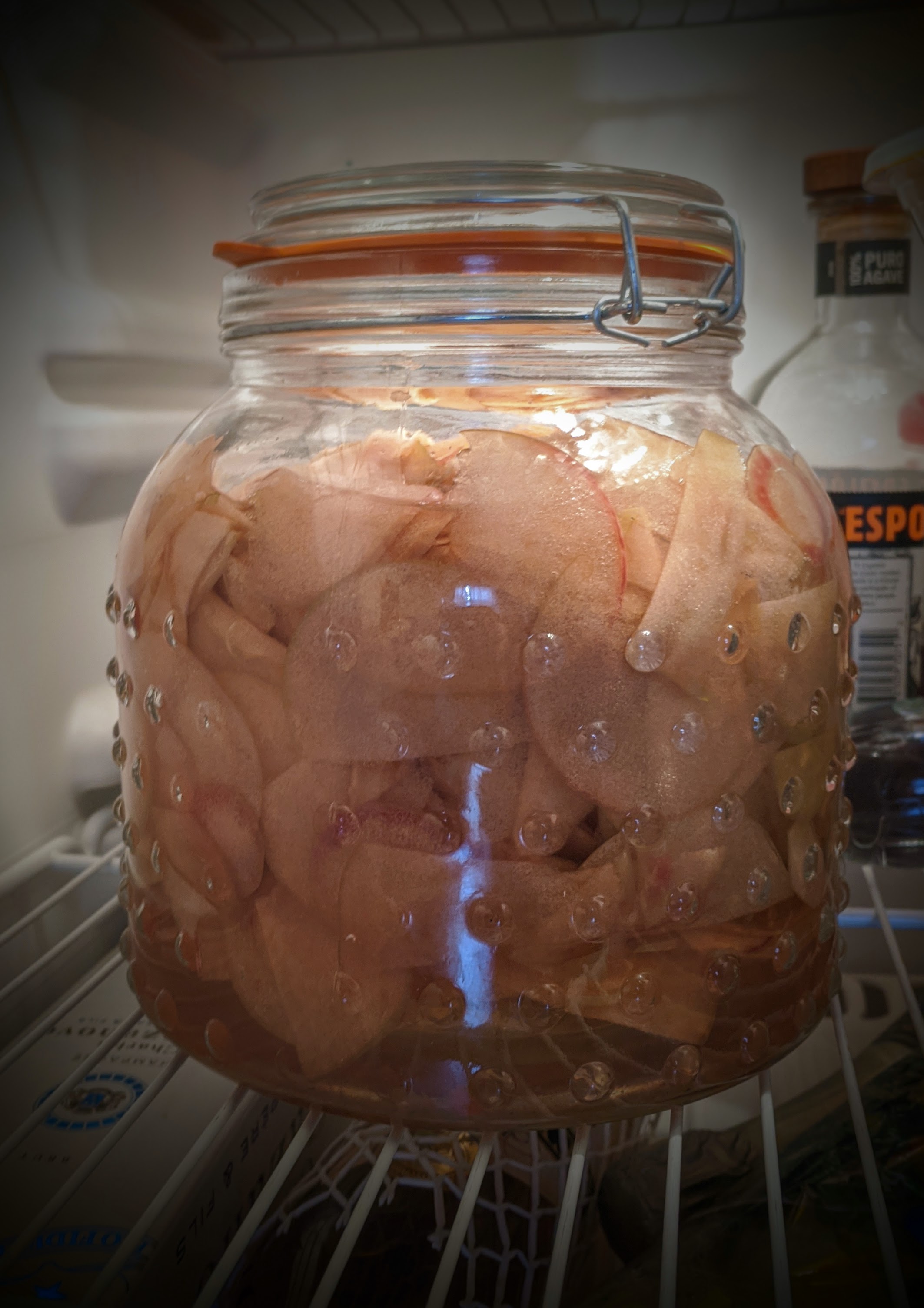 So off I went, following Paul Clarke's instructions, slicing the apples (and managing not to slice my thumb on the mandoline, the only kitchen tool that frightens me), adding a liter of dry vermouth (and then another 375ml after realizing a full liter wouldn't completely cover all eight apples), and tucking them into the fridge. After five days of daily shaking and checks, it was ready to strain and serve.